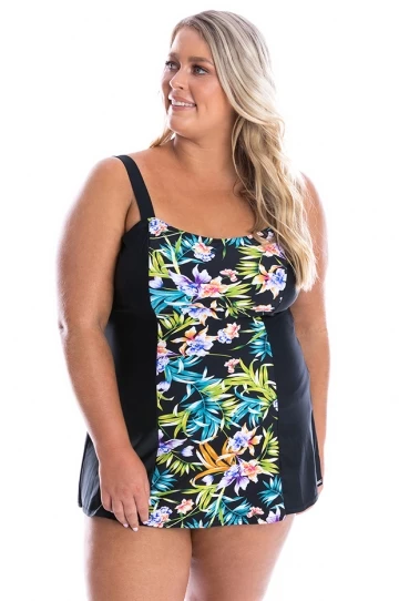 - Floral print with black side panels and straps