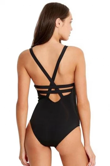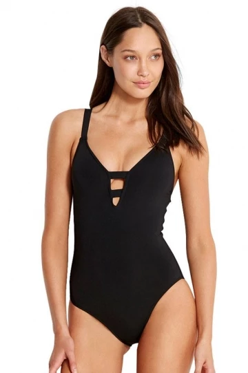 - Flirtatious plunge neck with strap feature